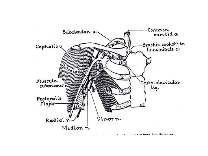 1. Axillary artery : divided into 3 parts First part : Supreme thoracic a. Second part : 1. Thoraco-acromial trunk Acromial branch Pectoral branch Clavicular branch Deltoid branch 2. Lateral thoracic a. Third part : give branches to supply head of humerus and scapular regions