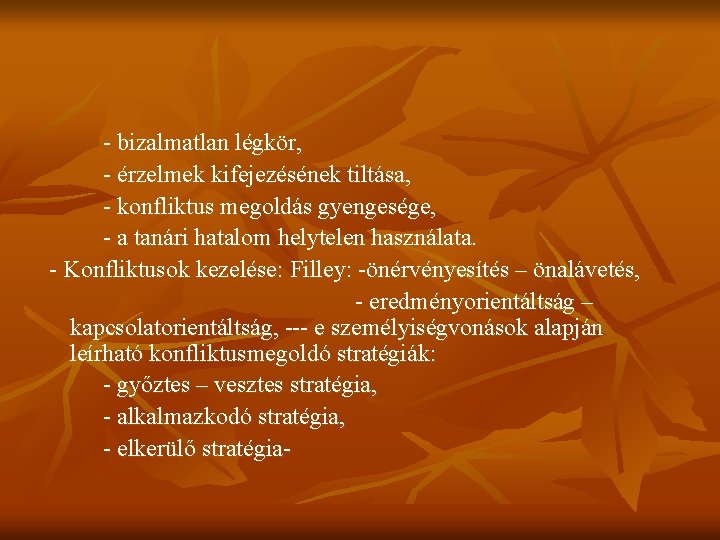 - bizalmatlan légkör, - érzelmek kifejezésének tiltása, - konfliktus megoldás gyengesége, - a tanári hatalom helytelen használata. - Konfliktusok kezelése: Filley: -önérvényesítés – önalávetés, - eredményorientáltság – kapcsolatorientáltság, --- e személyiségvonások alapján leírható konfliktusmegoldó stratégiák: - győztes – vesztes stratégia, - alkalmazkodó stratégia, - elkerülő stratégia-