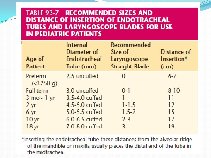 Tracheal Tube Sizes Insufflation Pressure ? Muscle Relaxants? Age Size (mm ID) Insertion length (Alveolar ridge) Preterm 1000 g Preterm 1000 -2500 g 2. 5 3. 0 6 -9 cm Neonate-6 Month 3. 0 -3. 5 10 cm 6 Month – 1 Yr 3. 5 -4. 0 11 cm 1 -2 Yrs 4. 0 -5. 0 12 cm Beyond 2 Yrs age (yrs)/4 + 4 age (yrs)/2 + 12