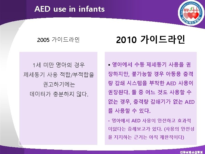 Defibrillation in pediatric BLS v For infants a manual defibrillator is preferred when a shockable rhythm is identified by a trained healthcare provider (Class IIb, LOE C). v If a manual defibrillator is not available, an AED equipped with a pediatric attenuator is preferred for infants. v If neither is available, an AED without a dose attenuator may be used (Class IIb, LOE C). v AEDs that deliver relatively high energy doses have been successfully used in infants with minimal myocardial damage and good neurological outcomes. 대한심폐소생협회