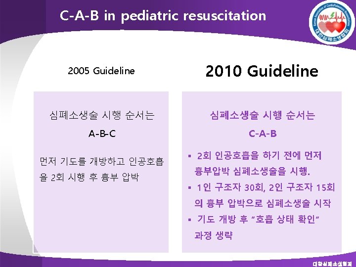 ABC or CAB? in PBLS v Incidence) Asphyxial CA ≫ VF CA ( in infants and children) v Ventilations are extremely important in ped resuscitation. ABC makes a difference? CAB 대한심폐소생협회