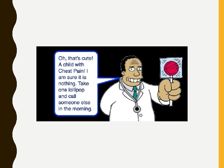 PEDIATRIC CHEST PAIN • One of the most common reasons for a child to visit a pediatrician or the Emergency Department • Various disorders may cause chest pain in children and adolescents – Cardiac – Gastrointestinal – Respiratory – Psychogenic – Idiopathic
