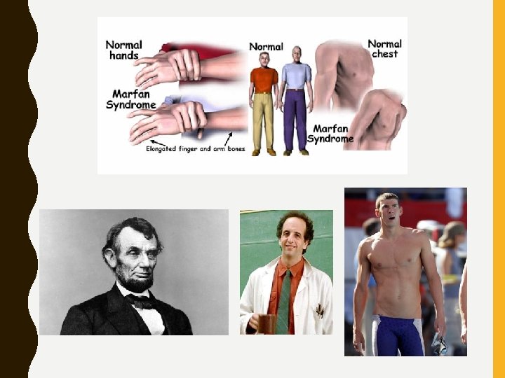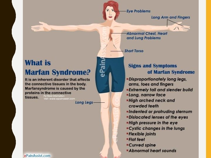 MARFAN SYNDROME • Genetic connective tissue disorder • Affects 1 in 5, 000 • Male and female of all races and ethnic groups • 3 out of 4 people inherit it • Severity of condition varies • Features and related disorders can appear at any age