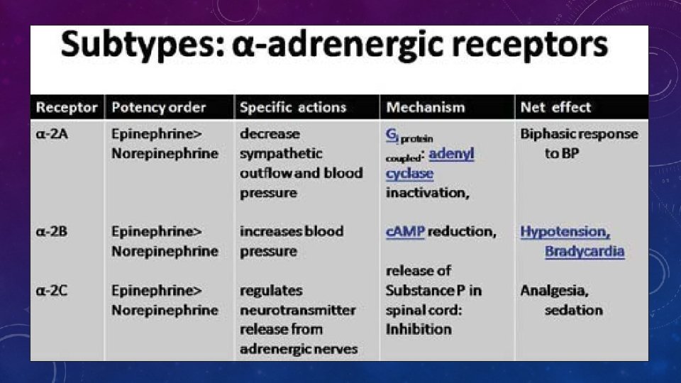 ALPHA 2 RECEPTORS • Mediates sedation • Cause fluctuations in BP • Postsynaptic locations: pancreas, kidney, fat • Mostly found in CNS • Agonists have benefits for us