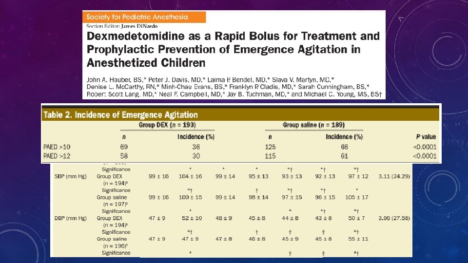REFERENCES • Ali, M. A. , & Abdellatif, A. A. (2013). Prevention of sevoflurane related emergence agitation in children undergoing adenotonsillectomy: A comparison of dexmedetomidine and propofol. Saudi journal of anaesthesia. 7(3), 296. • Chen, J. Y. , Jia, J. E. , Liu, T. J. , Qin, M. J. , & Li, W. X. (2013). Comparison of the effects of dexmedetomidine, ketamine, and placebo on emergence agitation after strabismus surgery in children. Canadian Journal of Anesthesia, 60(4), 385‐ 392 • Dawes, J. , Myers, D. , Görges, M. , Zhou, G. , Ansermino, J. M. , & Montgomery, C. J. (2014). Identifying a rapid bolus dose of dexmedetomidine (ED 50) with acceptable hemodynamic outcomes in children. Pediatric Anesthesia 24(12), 1260‐ 1267 • Enlow, W. M. , & Ardizzone, L. L. (2008). A systematic review: dexmedetomidine versus placebo to decrease the incidence of emergence delirium/emergence agitation (ED/EA) in pediatric patients. Clinical Scholars Review, 1(2). 89‐ 94 • Ergul, Y. , Unsal, S. , Ozyilmaz, I. , Ozturk, E. , Carus, H. , & Guzeltas, A. (2015). Electrocardiographic and electrophysiologic effects of dexmedetomidine on children. Pacing and Clinical Electrophysiology, 38(6), 682‐ 687 • Hauber, J. A. , Davis, P. J. , Bendel, L. P. , Martyn, S. V. , Mc. Carthy, D. L. , . . . & Tuchman, J. B. (2015) Dexmedetomidine as a rapid bolus for treatment and prophylactic prevention of emergence agitation in anesthetized children. Anesthesia & Analgesia, 121(5). 1308‐ 1315 • Hoff, S. L. , O'Neill, E. S. , Cohen, L. C. , & Collins, B. A. (2015). Does a prophylactic dose of propofol reduce emergence agitation in children receiving anesthesia? A systematic review and meta‐analysis. Pediatric Anesthesia, 25(7). 668‐ 676 • Lee, C. J. , Lee, S. E. , Oh, M. K. , Shin, C. M. , Kim, Y. J. , Choe, Y. K. , . . . & Kim, Y. H. (2010). The effect of propofol on emergence agitation in children receiving sevoflurane for adenotonsillectomy. Korean journal of anesthesiology, 59(2). 75‐ 81 • Sato, M. , Shirakami, G. , Tazuke‐Nishimura, M. , Matsuura, S. , Tanimoto, K. , & Fukuda, K. (2010). Effect of single‐dose dexmedetomidine on emergence agitation and recovery profiles after sevoflurane anesthesia in pediatric ambulatory surgery. Journal of anesthesia, 24(5). 675‐ 682 • Sun, L. , & Guo, R. (2014). Dexmedetomidine for preventing sevoflurane‐related emergence agitation in children: a meta‐analysis of randomized controlled trials. Acta Anaesthesiologica Scandinavica, 58(6), 642‐ 650 • Tobias, J. D. (2006). Clinical uses of dexmedetomidine in pediatric anesthesiology and critical care. Seminars in Anesthesia, Perioperative Medicine and Pain. 25(2) 57‐ 64 • Viswanath O, Kerner B, Jean Y‐K, Soto R and Rosen G. (2015) Emergence delirium: a narrative review. Journal of Anesthesiolical Clinical Science. 4(2) • Wagner, D. S. , & Brummett, C. M. (2006). Dexmedetomidine: as safe can be. Seminars in Anesthesia, Perioperative Medicine and Pain. 25(2) 77‐ 83) • Wilson, J. T. (2014). Pharmacologic, physiologic, and psychological characteristics associated with emergence delirium in combat veterans. AANA journal, 82(5) • Yu, M. , Han, C. , Jiang, X. , Wu, X. , Yu, L. , & Ding, Z. (2015). Effect and placental transfer of dexmedetomidine during caesarean section under general anaesthesia. Basic and clinical pharmacology & toxicology. 117(3). 204‐ 208 • Zhang, C. , Hu, J. , Liu, X. , & Yan, J. (2014). Effects of intravenous dexmedetomidine on emergence agitation in children under sevoflurane anesthesia: a meta‐analysis of randomized controlled trials. Plo. S one, 9(6)