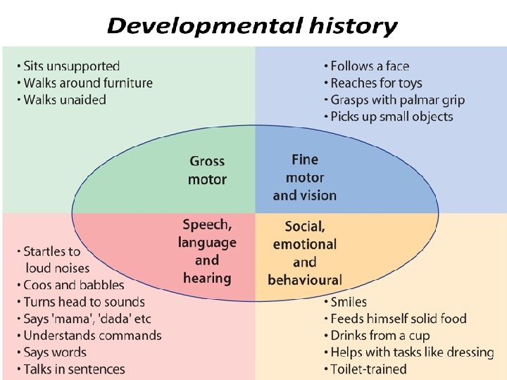 Developmental history • Age when able to… – Hold head erect when in sitting position – Roll from front to back; back to front – Sit alone; unsupported – Stand with support; without – Use words – Talk in sentences – Dress self – Age when toilet trained