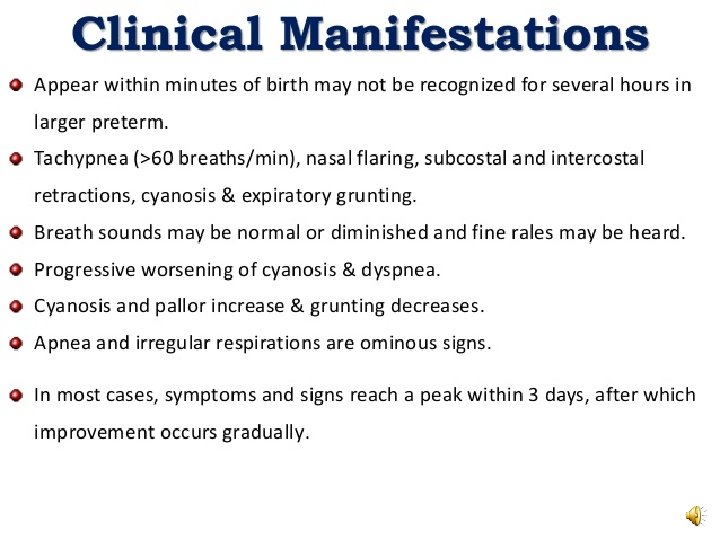 Objective: By the end of this lecture, the students will be able to: • Enlist causes of respiratory distress in a neonate • Identify signs and symptoms of respiratory illness • Outline a working management plan