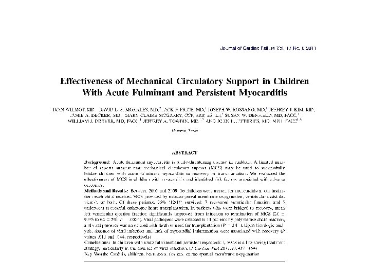 MCS - - This retrospective study evaluated MCS in the management of patients with acute fulminant myocarditis and persistent myocarditis from 1995 to 2009 at Texas Children’s Hospital, Houston, TX MCS included ECMO and/or VAD Primary outcome measures: Bridge to recovery (BTR), Bridge to transplant (BTT), or death Wilmot et al. J Car Fail. 2011