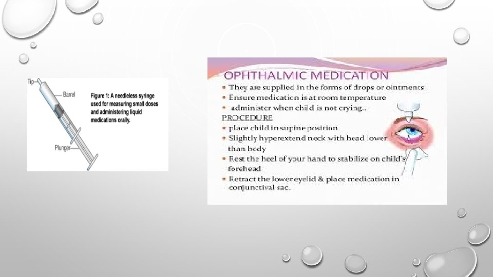 ORAL MEDS • CAN BE DRAWN UP WITH AN ORAL SYRINGE AND TRANSFERRED TO CUP FOR AN OLDER CHILD • MEDS SHOULD NOT BE MIXED IN AN INFANT’S OR TODDLER’S BOTTLE • AVOID GIVING MEDS TO A FUSSY INFANT, WHO COULD ASPIRATE • SOME CHEWABLE MEDS ARE AVAILABLE FOR OLDER CHILDREN