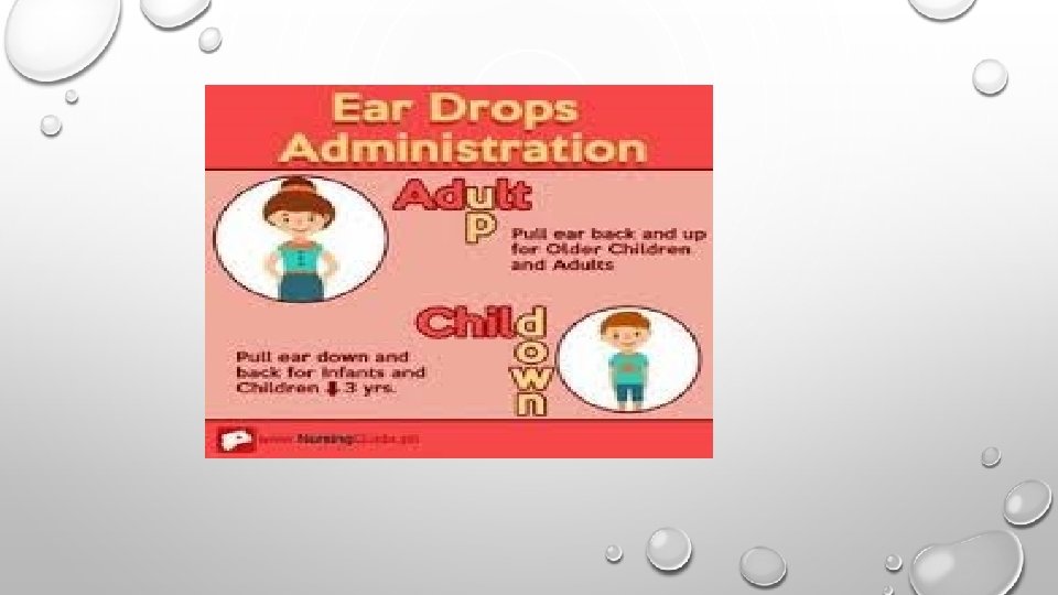 EARDROPS • TECHNIQUE: • PLACE CHILD ON RIGHT OR LEFT SIDE WITH EAR FACING UP • PULL THE CHILD’S EAR DOWN AND BACK • PULL THE PINNA, NOT THE EARLOBE! • INSTILL THE ORDERED NUMBER OF DROPS • A COTTON PLEDGET MAY BE PUT OVER THE EAR • NEVER INSERT A FOREIGN OBJECT INTO THE EAR CANAL!