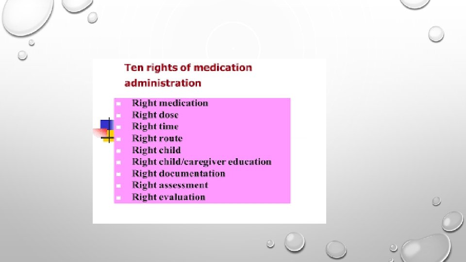 PEDIATRICS VS. ADULTS • DRUG DOSAGES FOR CHILDREN DIFFER GREATLY • DIFFERENT PHYSIOLOGICAL DIFFERENCES • NEONATES AND INFANTS • IMMATURE KIDNEY AND LIVER FUNCTION- DELAYS ABSORPTION AND ELIMINATION OF MEDS • SLOW GASTRIC EMPTYING • DECREASED GASTRIC SECRETIONS= DECREASED ABSORPTION • LOWER CONCENTRATION OF PLASMA PROTEINS • LESS TOTAL BODY FAT & MORE TOTAL BODY WATER • AFFECTS WATER SOLUBLE AND FAT-SOLUBLE MEDS