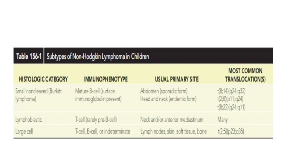 Treatment • For Hodgkin disease: a combination of chemotherapy with or without lowdose radiation therapy. • Chemotherapy usually consists of some combination of cyclophosphamide, vincristine, procarbazine, doxorubicin, bleomycin, vinblastine, prednisone, and etoposide. • More aggressive chemotherapy is used to treat NHL: cyclophosphamide, moderate- to high-dose methotrexate, cytarabine, doxorubicin, ifosfamide, and etoposide. • The prognosis is generally excellent. There is an approximately 90% 5 -year overall survival rate,