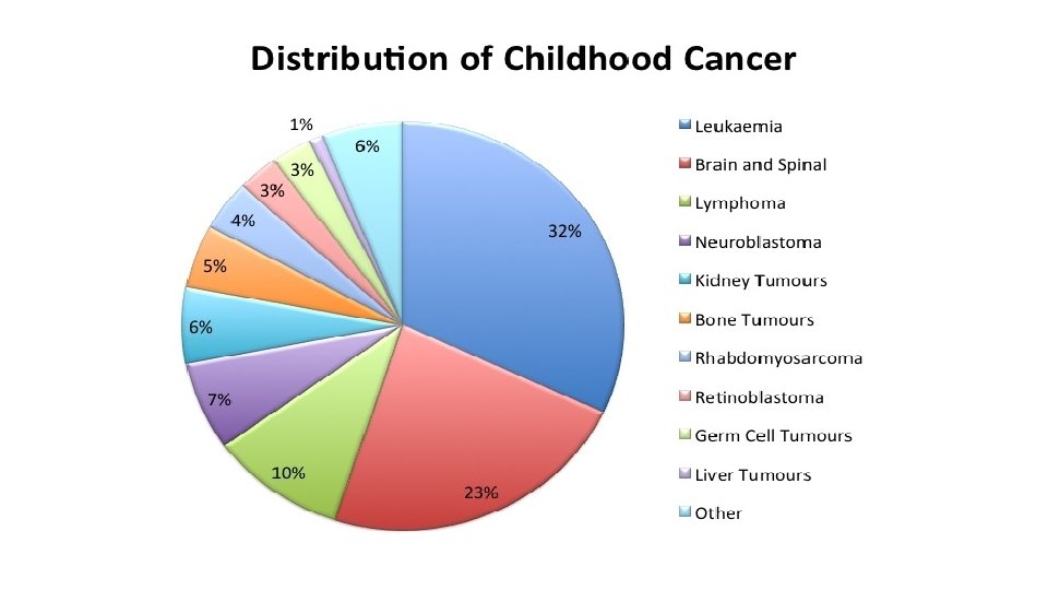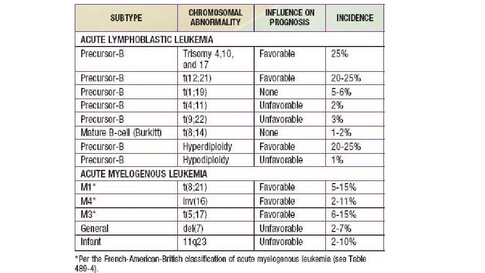The leukemias • A group of malignant diseases in which genetic abnormalities in a hematopoietic cells give rise to an unregulated clonal proliferation of cells. • Accounts for 31% of pediatric malignancies • Acute lymphoblastic leukemia (ALL) accounts for 77% of cases • Acute myelogenous leukemia (AML) 11% • Chronic myelogenous leukemia (CML) 2 -3% • Juvenile myelomonocytic leukemia 1 -2%