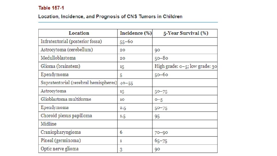 Treatment • depends on the tumor type, location, size, and associated symptoms. • High-dose dexamethasone often is administered immediately to reduce tumor-associated edema • radiation therapy often is combined with chemotherapy • Surgical complete excision, or maximal debulking • The 5 -year overall survival rate associated with all childhood CNS tumors is approximately 50% to 60%