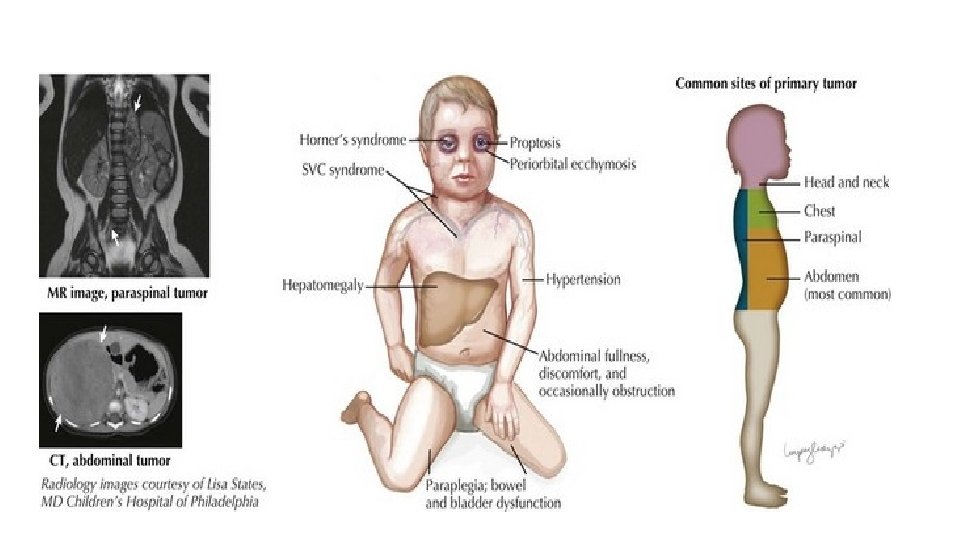 Neuroblastoma • The most common extracranial solid tumor of childhood and the most common malignancy in infancy. • derived from neural crest cells that form the adrenal medulla and the sympathetic nervous system • Etiology unknown • The median age at diagnosis is 20 months
