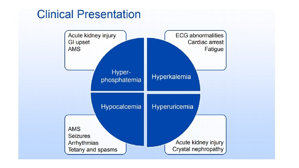 Tumor lysis syndrome (TLS) • Sudden massive lysis of tumor cells leading to release their contents into the bloodstream occur spontaneously or after initiation of chemotherapy • metabolic disorders: hyperkalemia, hyperphosphatemia, hypocalcemia, and hyperuricemia leading to end-organ damage. • Can lead to acute kidney injury (AKI), fatal arrhythmias, and even death. • 30% of patients need hemodyalisis • Morality rate 15%
