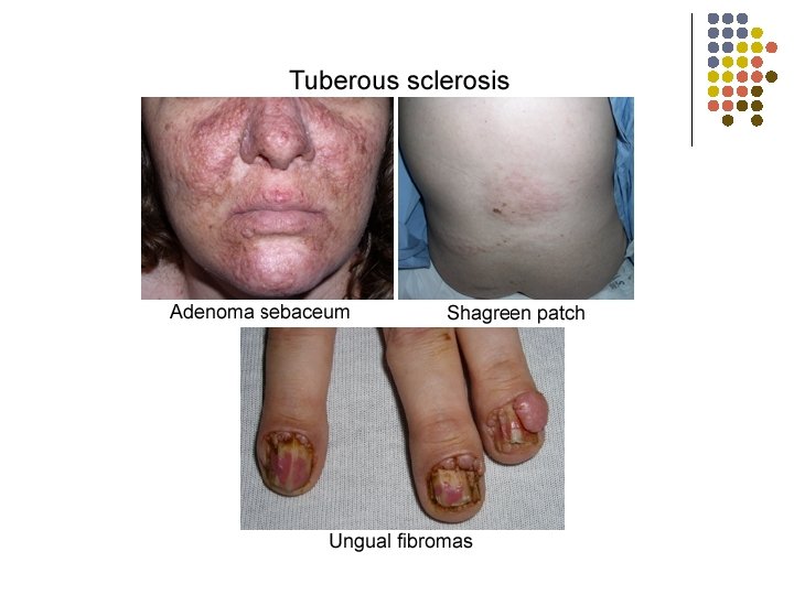 Tuberous Sclerosis l l Autosomal dominant Chromosomes 9 (hamartin) and 16 (tuberin) Skin hypopigmentations (“Ash leaf” spots) Benign hamartomas: l l l skin l adenoma sebaceum on face l shagreen patch (brown leathery) on forehead or lower back brain, retina, heart, kidney Seizures in 80 -90 %
