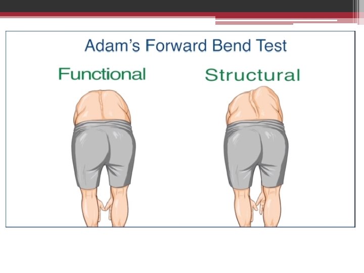 Adam's Forward Bending Test functional vs structural • Ask the patient to bend forward with the feet together and arms hanging down • Stand at the back of the patient • Look along the horizontal plane of the spine searching for abnormalities of the spinal curve in addition to a prominent rib hump and asymmetry of the trunk.