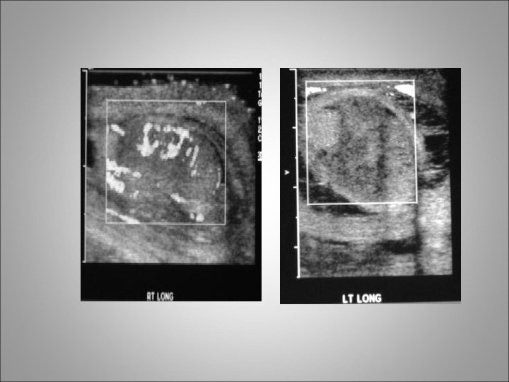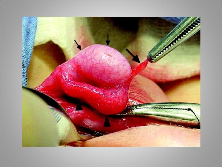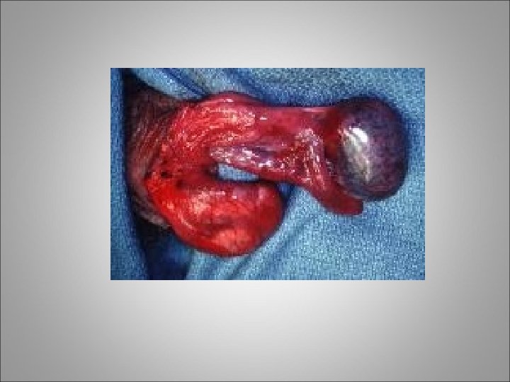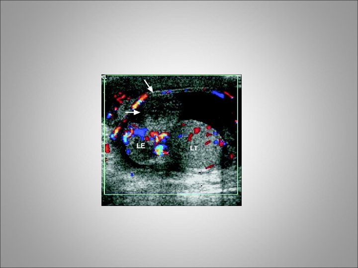 Torsion of the Spermatic Cord (Intravaginal) • Testis can be riding high in the scrotum or with transverse orientation • The absence of a cremasteric reflex is a good indicator of torsion of the cord • After several hours an acute hydrocele or massive scrotal edema obliterates all landmarks • Color Doppler examination had a diagnostic sensitivity of 88. 9% and a specificity of 98. 8%, with a 1% rate of falsepositive results • When the diagnosis of torsion of the cord is suspected, prompt surgical exploration is warranted • When torsion of the spermatic cord is found, exploration of the contralateral hemiscrotum must be carried out