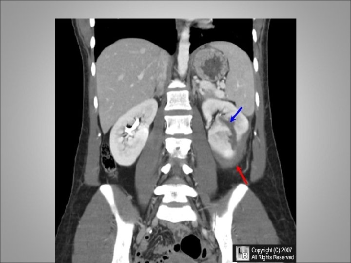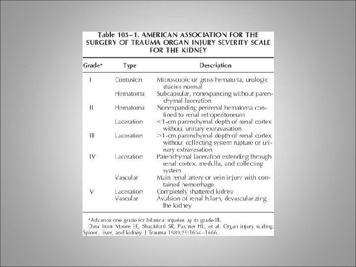 Indications for Imaging • A significant deceleration or high-velocity injury such as one sustained in a high-speed motor vehicle accident, a pedestrian/bicycle-motor vehicle accident, a fall from more than 15 feet, or a strike to the abdomen or flank with a foreign object (e. g. , football helmet, baseball bat) • Significant trauma that has resulted in fractures of thoracic rib cage, spine, pelvis, or femur, or bruising of the torso/perineum, or signs of peritonitis • Gross hematuria • Microscopic hematuria (<50 red blood cells per highpowered field) associated with shock (systolic blood pressure less than 90 mm Hg) • penetrating injuries