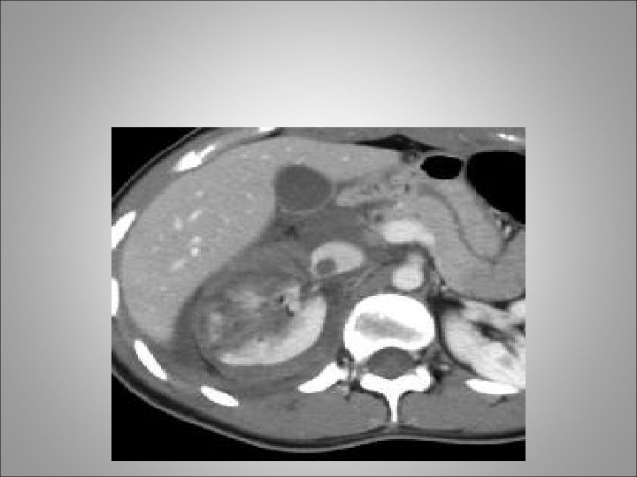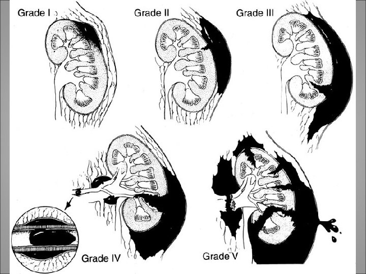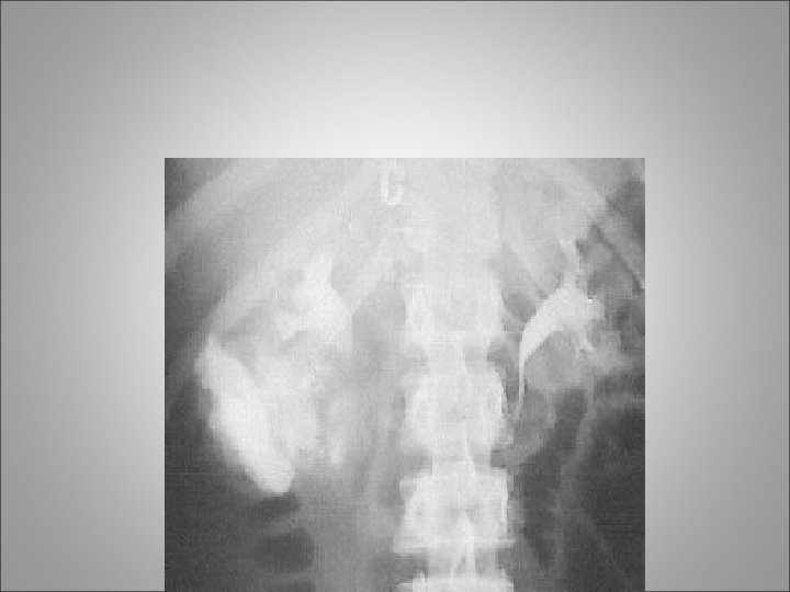 Imaging • Single-Shot Intravenous Pyelography Is useful in the unstable patient requiring emergent laparotomy • Once the patient is stabilized in the operating room, single-shot intravenous pyelography (IVP) (2 m. L/kg intravenous bolus of contrast agent) with the radiograph taken 10 to 15 minutes after injection may be of benefit • Use of Arteriography is useful in patients with persistent or delayed hemorrhage which usually arises from the development of arteriovenous fistulas or pseudoaneurysm • Approximately 25% of patients with grade 3 to grade 4 renal trauma, managed in a nonoperative fashion, will develop persistent or secondary (delayed) hemorrhage • RGP +- DJ indications after renal trauma: (1) to rule out the presence of a partial/total ureteral disruption and (2) to aid in the management of a symptomatic urinoma