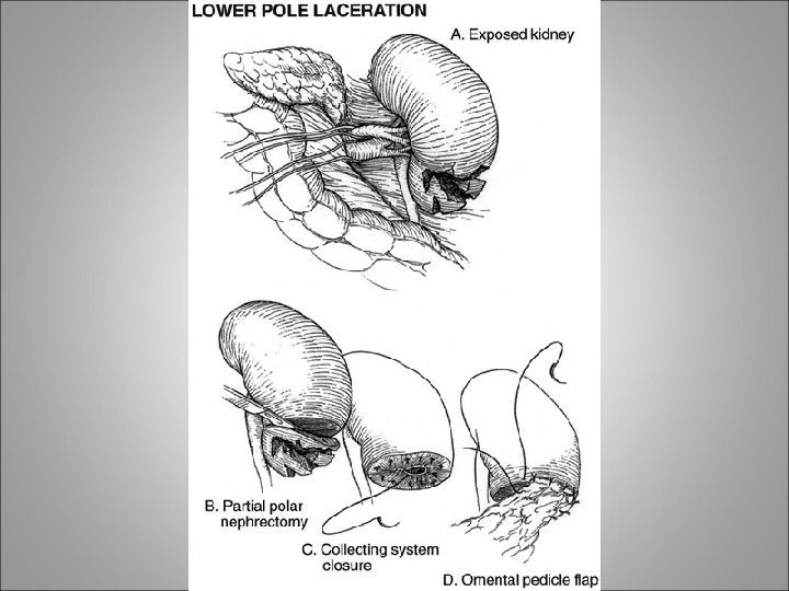 Surgical approach • The goals of operative therapy are hemorrhage control and renal tissue preservation • Midline incision, look for other injuries, central control of vessels • Renal exploration, débridement of nonviable tissue, hemostasis by individual suture ligation of bleeding vessels, watertight closure of the collecting system, and coverage or approximation of the parenchymal defect