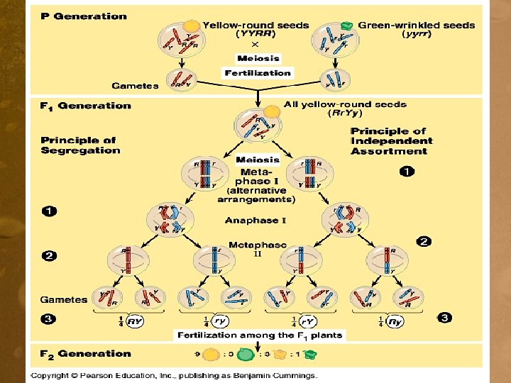 • F 1: Yy. Rr x Yy. Rr • What are the predicted phenotypic ratios of the offspring? • ¾ yellow ¾ round • ¼ green ¼ wrinkled ¼ (green) x ¼ (wrinkled) = 1/16 green, wrinkled 9: 3: 3: 1 phenotypic ratio