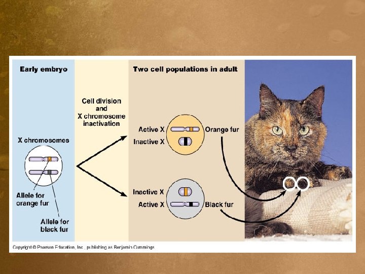 Lyon Hypothesis • Which X inactivated is random. • Inactivation happens early in embryo development by adding CH 3 groups to the DNA. • Result - body cells are a mosaic of X types.
