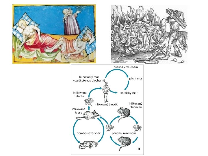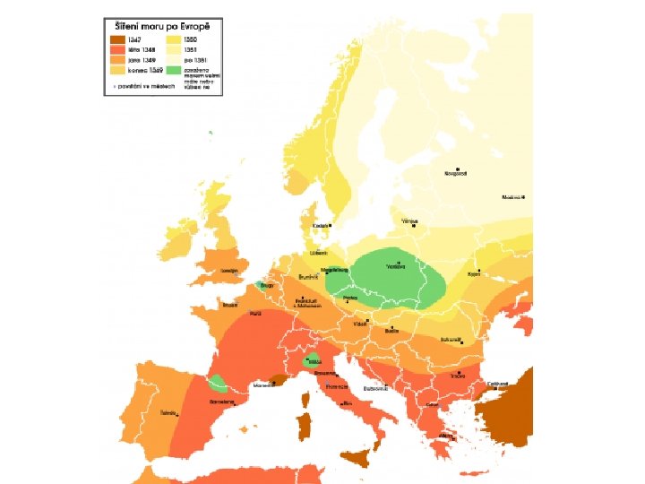 NEJVĚTŠÍ MOROVÉ EPIDEMIE • Ve skutečnosti mor v Evropě takřka „zdomácněl“ na dalších neméně 150 let, kdy se silnějšími či slabšími vlnami pustošil všechna větší města • V Číně, kde tato epidemie začala asi o 100 let dříve než v Evropě (zhruba roku 1246), vyhubila za půl roku asi 13 milionů lidí • postupně se rozšiřovala na západ a kudy prošla, tam bylo prakticky vylidněno (Jeruzalém, Damašek. . podél starých obchodních cest) • Tentokrát se „černá smrt“ nezastavila ve středomoří či Anglii, zima jí nevadila, a např. v Norsku či na Islandu vyhubila většinu populace • Trvalo dlouho, než zpustošené země dosáhly dřívější prosperity