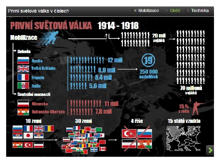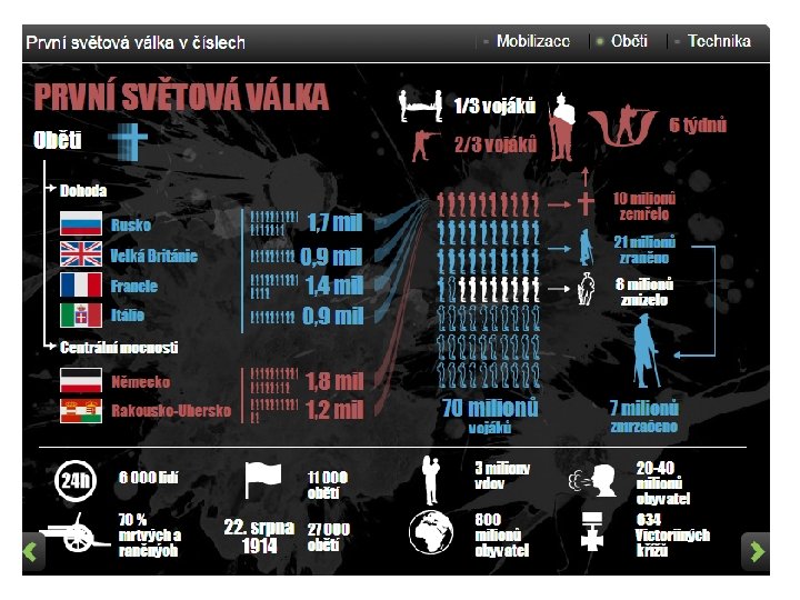 GLOBÁLNÍ SVĚTOVÉ VÁLKY – 1. SVĚTOVÁ VÁLKA • První světová válka zasáhla Evropu, Afriku a Asii a probíhala ve světových oceánech • Bezprostřední záminkou k válce se stal úspěšný atentát na arcivévodu a následníka trůnu Františka Ferdinanda d'Este • Rakousko-Uhersko odvetou vyhlásilo válku Srbsku, čímž vyvolalo řetězovou reakci vedoucí k světové válce • Během jednoho měsíce se Evropa ocitla ve válečném konfliktu • Válka propukla mezi dvěma koalicemi: mocnostmi Dohody a Ústředními (centrálními) mocnostmi • Zúčastnilo se jí nakonec 30 zemí, kde tehdy žilo 1, 5 miliardy lidí (75 % lidstva)