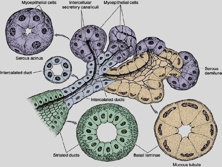 Žlázové vývody – vsunutý (jednovrst. plochý ep. , jen v serózních a smíšených žlázách) – žíhaný (jednovrst. kubický ep. ; bazální labyrint žíhání) – interlobulární (jednovrst. – vrst. cylindr. ep. , probíhají v septech) – hlavní (vrst. dlažd. ep. )