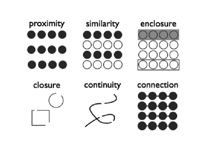 Principy organizace percepčního pole Zákon pregnantnosti (dobrého tvaru) Zákon proximity (blízkost) Zákon kontinuity (dobré křivky) Zákon podobnosti Zákon společného osudu Zákon uzavřenosti a asi stovka dalších…