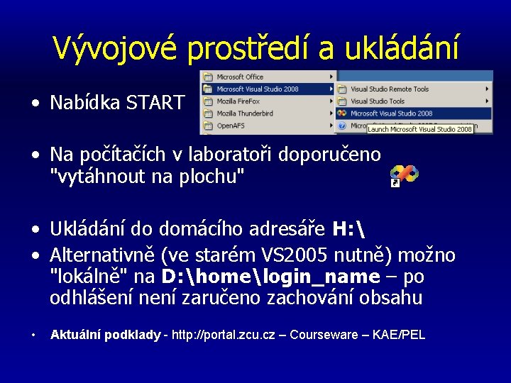 Vývojové prostředí a ukládání • Nabídka START • Na počítačích v laboratoři doporučeno "vytáhnout na plochu" • Ukládání do domácího adresáře H: • Alternativně (ve starém VS 2005 nutně) možno "lokálně" na D: homelogin_name – po odhlášení není zaručeno zachování obsahu • Aktuální podklady - http: //portal. zcu. cz – Courseware – KAE/PEL