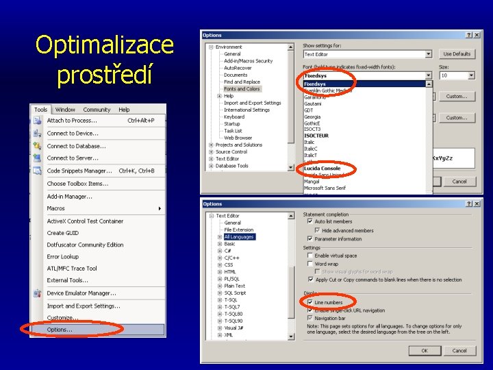 Více projektů v solution • V rámci solution je možné mít více projektů – v případě Express edice VS pouze stejného typu – v případě Professional a lepší je možné je míchat libovolně – pravé myšítko – Add/New project • Nutno zvolit, který projekt se má spouštět – jak pro F 5 (s debug), tak pro Ctrl+F 5 – nastavit vlastnost projektu "Set as Startup Project" • pravé myšítko na projektu • nebo menu Project