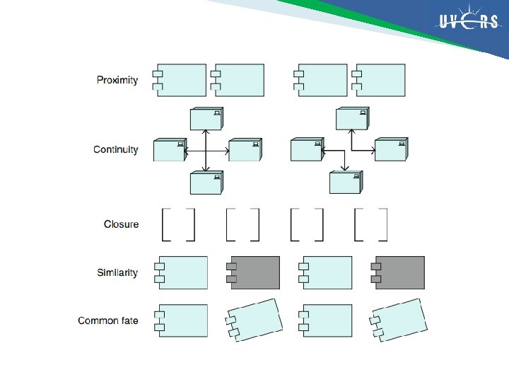 Prinsip 2 dalam visualisasi model yang kompleks: � Proximity: menghubungkan obyek yang saling berdekatan. � Continuity: sebuah garis dianggap sebagai penghubung arah. � Closure: menganggap obyek yang belum lengkap sebagai lengkap dan obyek asimetris sebagai simetris. � Similarity: menganggap obyek yang serupa sebagai satu kesatuan dalam sebuah unit. � Common fate: menganggap obyek berbeda yang bergerak atau memiliki fungsi yang serupa sebagai sebuah unit.