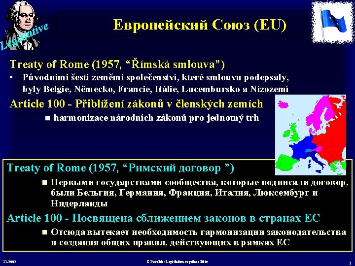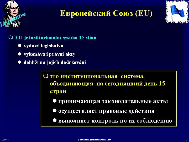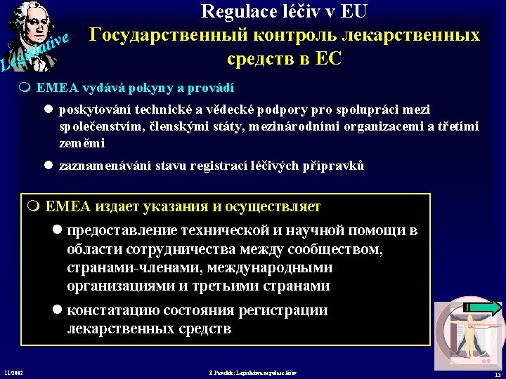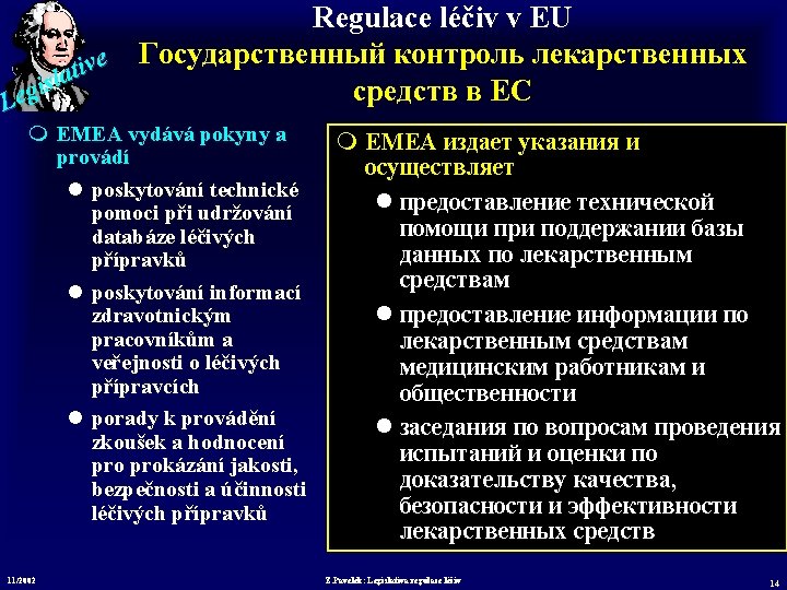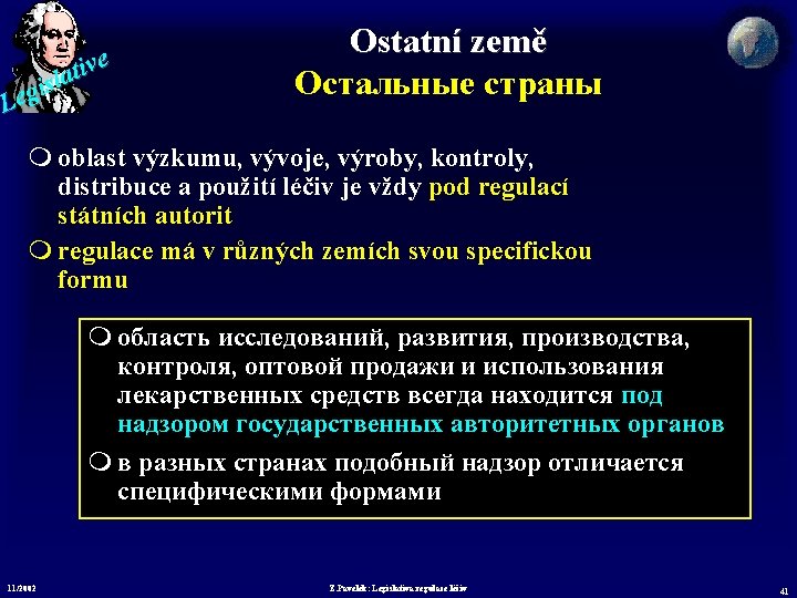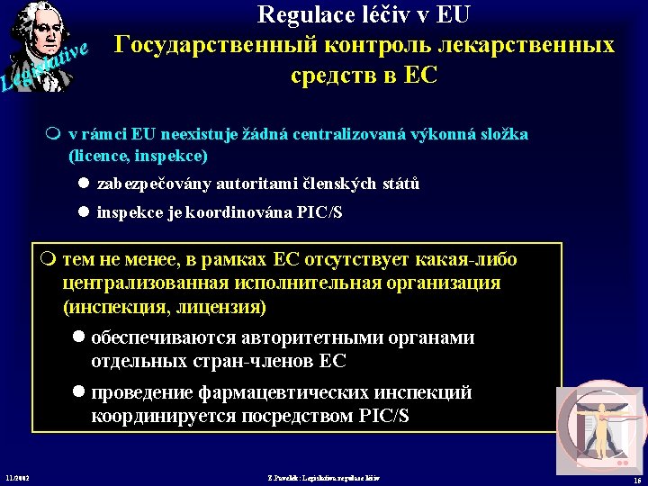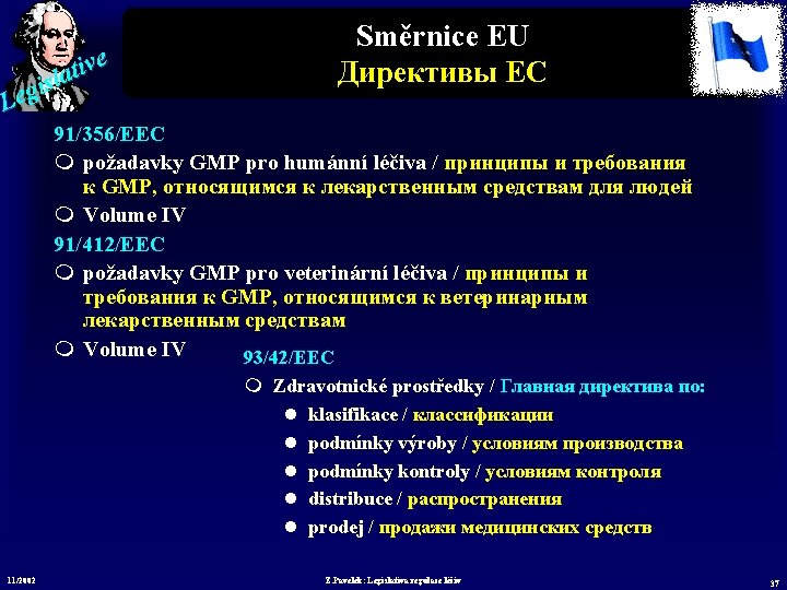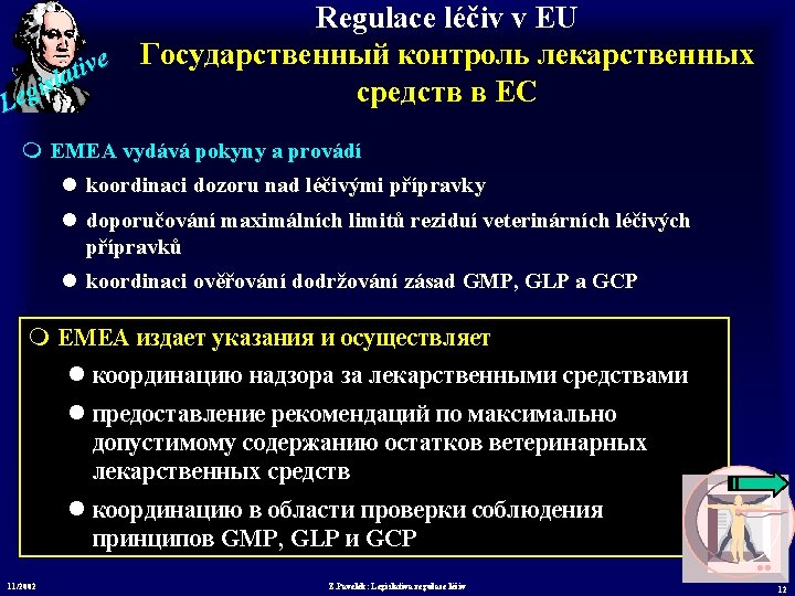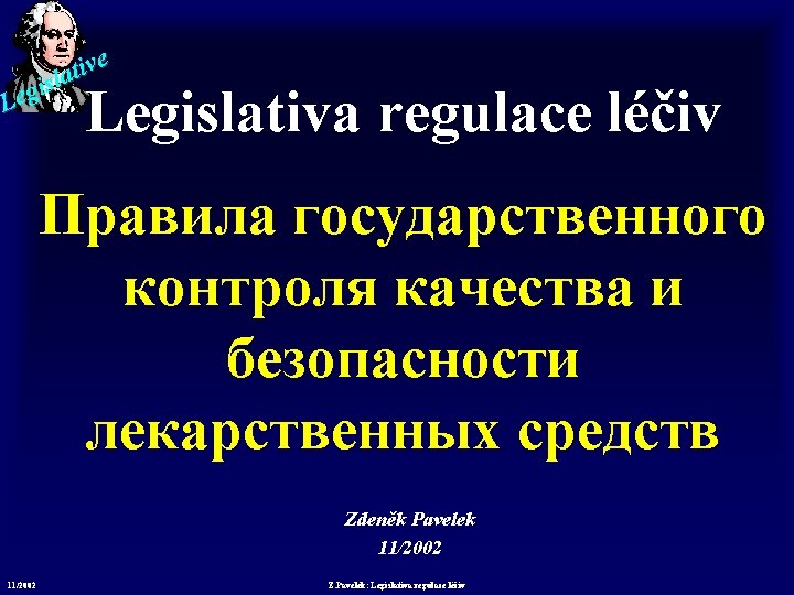 Předpisy pro regulaci léčiv e v i t Правила государственного контроля. . . sla i g Le Protože je častokrát problematické se orientovat v této "legislativní džungli", je vhodné si uvést některé základní principy, předpisy nebo doporučení jednotlivých států nebo organizací. States, Union l European Union (EU) l U. S. A. l others 11/2002 Поскольку часто ориентироваться в этих “законодательных джунглях” совсем не просто, имеет смысл привести отдельные главные принципы или рекомендации отдельных стран либо организаций. National and International autorities l PIC/S l FDA Profesiomal organizations l ICH l ISPE l WHO l PDA Z. Pavelek: Legislativa regulace léčiv 2