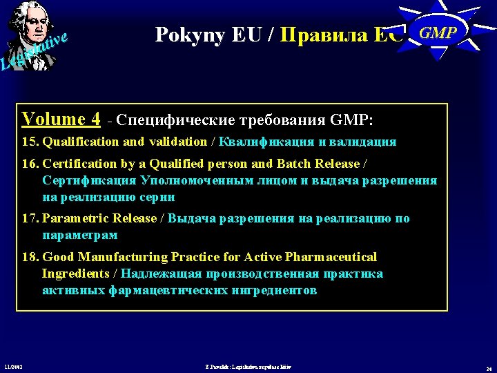 e v i t sla i g Le Pokyny EU / Правила ЕС Pokyny EU GMP Volume 4 - Специфические требования GMP: 11. Computerised Systems / Компьютерные системы 12. Use of Ionising Radiation in the Manufacture of Medicinal Products / Использование ионизирующего излучения в производстве лекарственных средств 13. Manufacture of Investigational Medicinal Products / Производство лекарственных средств для клинических исследований 14. Manufacture of Products derived from Human Blood or Human Plasma / Массовое производство продукции из человеческой крови или плазмы 11/2002 Z. Pavelek: Legislativa regulace léčiv 25