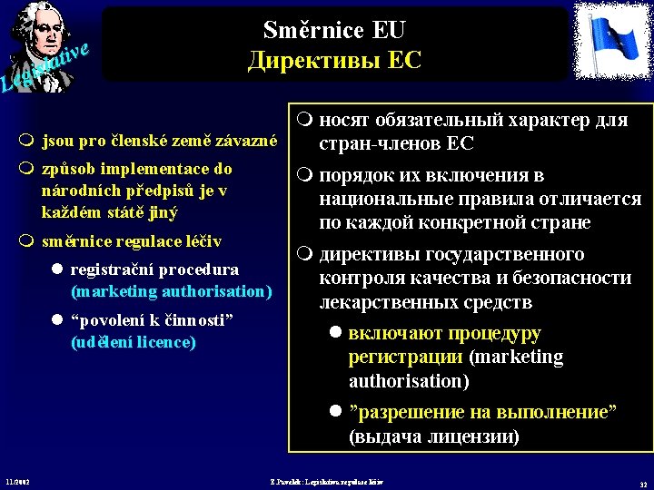 e v i t sla i g Le Pokyny EU / Правила ЕС Pokyny EU m Volume 9 Pharmacovigilance l Medicinal products for human and veterinary use l Uvádí požadavky na provádění farmaceutického dohledu při používání humánních a veterinárních léčiv. l Приводятся требования по выполнению фармацевтического надзора при использовании лекарственных средств для человека и ветеринарии. 11/2002 Z. Pavelek: Legislativa regulace léčiv 31