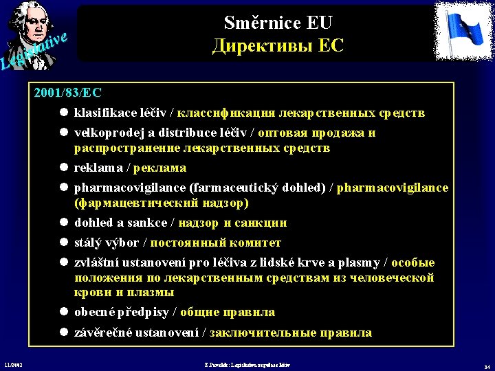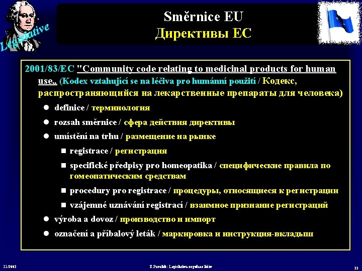 e v i t sla i g Le Směrnice EU Директивы ЕС 2001/82/EC "Community code relating to medicinal products for veterinary use"(Kodex vztahující se na léčiva pro veterinární použití) (Кодекс, распространяющийся на лекарственные препараты для ветеринарии) l obdobný obsah l отличается подобным содержанием 11/2002 Z. Pavelek: Legislativa regulace léčiv 36