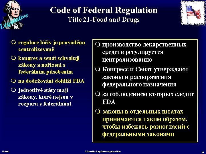 e v i t sla i g Le США - федеральныe законы Léčiva podléhají v USA kontrole vzhledem k existenci a působení čtyř federálních zákonů: l "Federal Food, Drug and Cosmetic Act„ l "Generic Drug Enforcement Act„ l "Fair Packiging and Labelling Act„ l "Public Health Services Act" В США лекарственные средства подлежат контролю в связи с наличием и действием четырех федеральных законов: : l "Federal Food, Drug and Cosmetic Act„ l "Generic Drug Enforcement Act„ l "Fair Packiging and Labelling Act„ l "Public Health Services Act" 11/2002 Z. Pavelek: Legislativa regulace léčiv 39