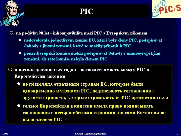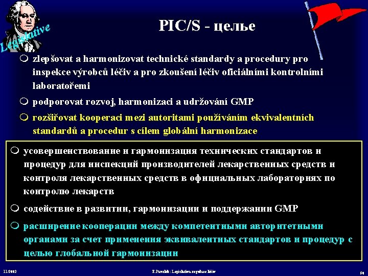 Pharmaceutical Inspection Co-operation Schema e v i t PIC/S a l s i Leg m PIC (Pharmaceutical Inspection Convention) l 1970, EFTA (European Free Trade Association) l "Konvence pro vzájemné uznávání inspekcí, týkajících se výroby farmaceutických produktů„ l „Конвенция о взаимном признании инспекций в отношении производства фармацевтической продукции“ l The Convention for the Mutual Recognition of Inspections in respect of the Manufacture of Pharmaceutical Products 11/2002 Z. Pavelek: Legislativa regulace léčiv 45