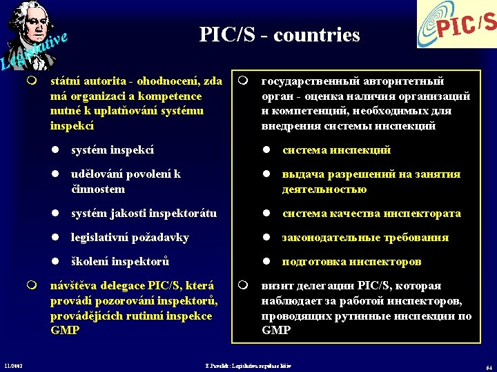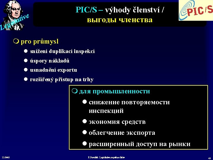 e v i t sla i g Le PIC/S m v listopadu 1995 - PIC Scheme (Pharmaceutical Inspection Co-operation Scheme) jako rozšíření PIC m PIC Scheme a PIC fungují paralelně a jsou označovány jako PIC/S m. В ноябре 1995 - PIC Scheme (Pharmaceutical Inspection Co-operation Scheme) как расширение PIC m. PIC Scheme и PIC работают параллельно, неся название PIC/S 11/2002 Z. Pavelek: Legislativa regulace léčiv 48