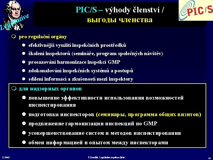 e v i t sla i g Le PIC/S - Правила PIC/S - m SOP a vysvětlující pokyny / СОП и пояснительные указания (explanatory notes) l PI 005 -1: Guidance on Parametric Release l PI 009 -1: Aide-Memoire on the Inspection of Utilities l PI 010 -1: SOP - Procedure for Handling Rapid Alerts and Recalls Arising from Quality Defects l PE 008 -1: Explanatory Note for Industry on the Preparation of a Site Master File 11/2002 Z. Pavelek: Legislativa regulace léčiv 61