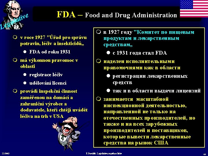 e v i t sla i g Le Austrálie Австралия m "Code of GMP„ m представляет собой утвержденные нормативы и методы по GMP m představuje schválené normy a praktiky mezi vládou a průmyslem m Státní autorita "Therapeutic Goods Administration" (TGA) má značné pravomoce v oblasti regulace léčiv (tj. registrace, udělování licencí a inspekční činnost) 11/2002 m Государственный надзорный орган „Therapeutic Goods Administration” (TGA) наделен значительными правомочиями в области контроля лекарственных средств (т. е. регистрации, выдачи лицензий и собственно контрольной деятельности) Z. Pavelek: Legislativa regulace léčiv 43