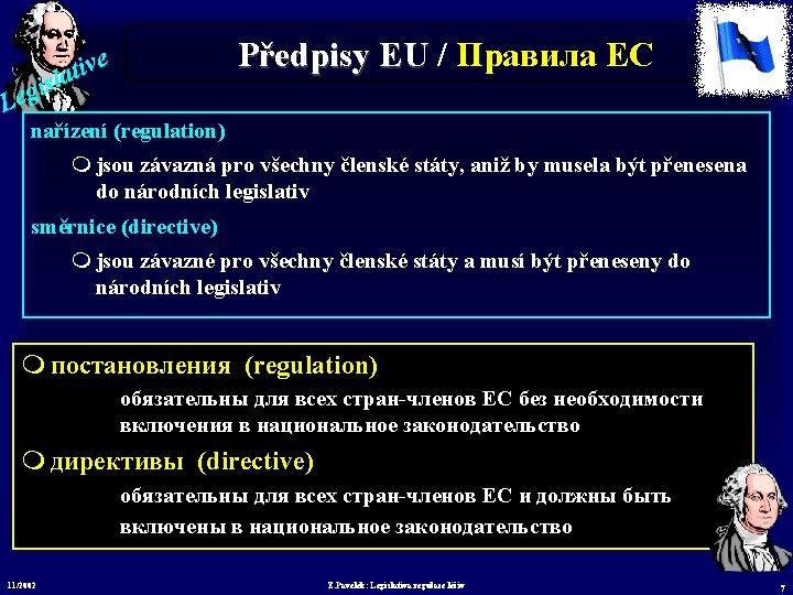 e v i t sla i g Le Европейский Союз (EU) m европейские органы m evropské orgány l European Central Bank l Европейский центральный банк - European Central Bank l European Investment Bank l Европейский инвестиционный банк European Investment Bank l Economic and Social Committee l Социально-экономический Комитет - Economic and Social Committee of the Regions l Комитет по регионам - Committee of the Regions l European Ombudsman m evropské agentury - ustavené pro řešení technických, vědeckých a organizačních otázek 11/2002 l Европейский посредник по жалобам на действия государственных учреждений - European Ombudsman m европейские агентства - учрежденные для рассмотрения организационных вопросов, проблематики науки и техники Z. Pavelek: Legislativa regulace léčiv 6
