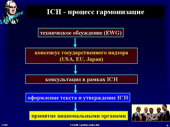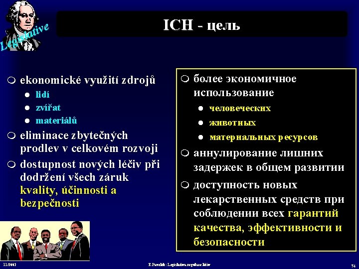 e v i t sla i g Le ICH m Committee on Proprietary Medicinal Products (CPMP) m European Federation of Pharmaceutical Industries' Associations (EFPIA) m Ministry of Health and Welfare, Japan (MHW) m Japan Pharmaceutical Manufactures of Association (JPMA) m US Food and Drug Administration (FDA) m Pharmaceutical Research and Manufacturers of America (Ph. RMA) существуют: WHO, EFTA и Canada 11/2002 Z. Pavelek: Legislativa regulace léčiv 73