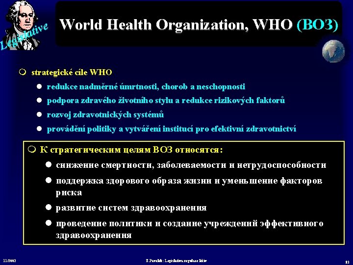 e v i t sla i g Le World Health Organization, WHO (ВОЗ) , WHO m v roce 1948, jako orgán Organizace spojených národů m je organizována prostřednictvím sekretariátu a regionálními úřady v jednotlivých oblastech světa m в 1948 году как один из органов Организации объединенных наций m организована посредством секретариата и региональных учреждений в отдельных регионах мира 11/2002 Z. Pavelek: Legislativa regulace léčiv 82