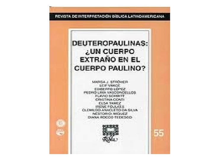Editorial - Marga J. Ströher. 1. El cuerpo paulino - Un débil fuerte y el poder debilitante - Leif Vaage. 2. Una introducción a II de Tesalonicenses - Ediberto López. 3. Colosenses y Efesios – Desdoblamientos de la tradición paulina - Pedro Lima Vasconcellos. 4. El misterio del Misterio en la carta a los Efesios - Flávio Schmitt. 5. Introducción a las epístolas pastorales - Cristina Conti. 6. Visibilidad, exclusión y control de las mujeres en la Primera carta a Timoteo - Elsa Tamez. 7. Los códigos de deberes domésticos en Colossenses 3, 184, 1 y Efesios 5, 22 -6, 9 – Estrategias persuasivas, reacciones provocadas - Irene Foulkes.