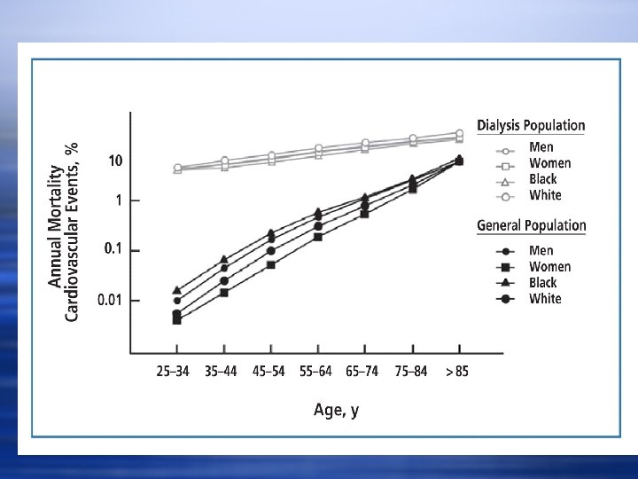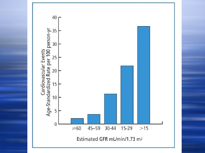 Stage 3 CKD w 7. 6 million Americans w Asymptomatic (the Silent Killer) w Severely increased risk of cardiovascular events and death w These patients are unlikely to live long enough to require dialysis (one in twenty will reach stage 5)