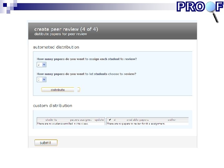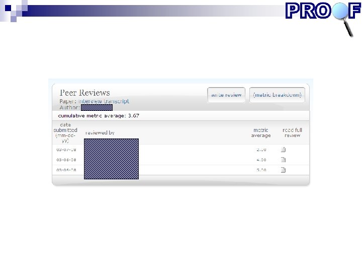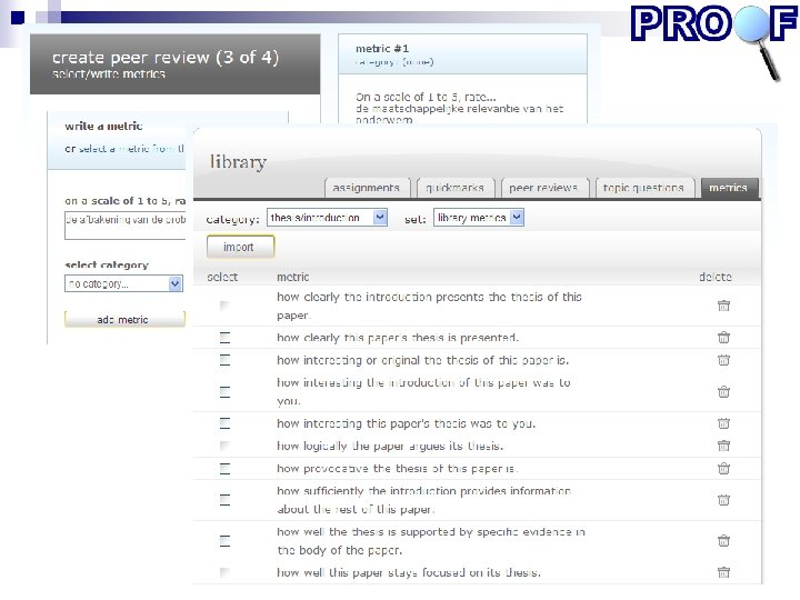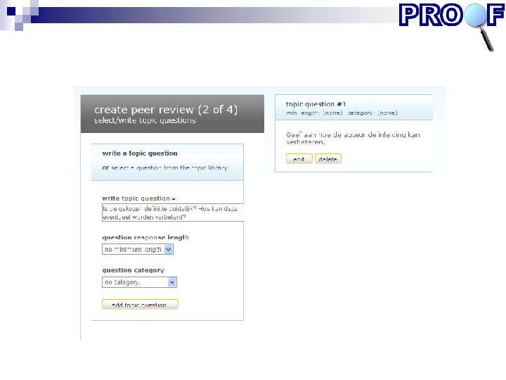 Keuze van systemen Onderwijskundige criteria (bron: literatuurstudie) Functionele criteria (bron: interviews gebruikers + technische randvoorwaarden en eisen organisatie) Relevante thema’s bij selectie peer review systemen • Doel: formatief / summatief • Wat : bv. schrijfproduct, samenwerking, vaardigheidsdemonstratie • Soort peer feedback: • Gesloten (schaalvragen, cijfers, ja/nee) • Open (toelichting op criteriageleide beoordeling of zonder criteria) • Algemeen of specifiek commentaar • Interactief of eenzijdig • Monitoringsmogelijkheden • Gebruikersgemak • Beheer: kosten, continuïteit leverancier, etc. (zie www. proof-project. nl)